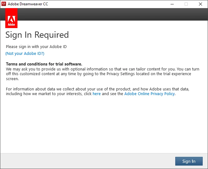 I'm trying to reopen Dreamweaver - and the same message pops up asking me to sign in with my Adobe ID, etc. - an eternal loop.