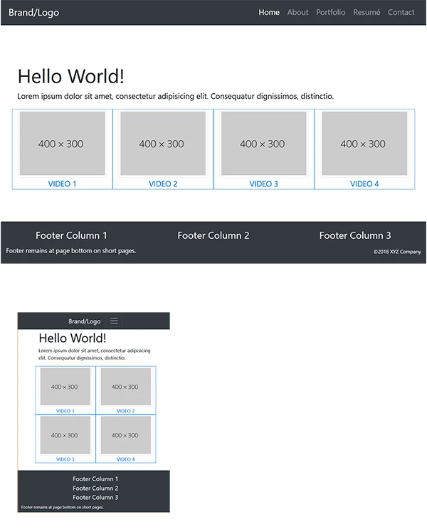 Below a Bootstrap 4 layout: 4 across on desktop, 2 across on tablet, vertically sacked on mobile.