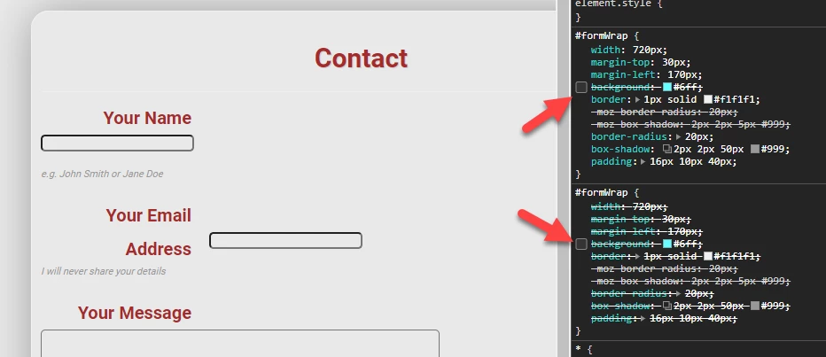 I use Firefox and its Developer Tools. I load up a page and by ticking/unticking the property values I can see the effect of any changes I make. Nothing new here you say, and I have been happily working on my website pages in this way.
