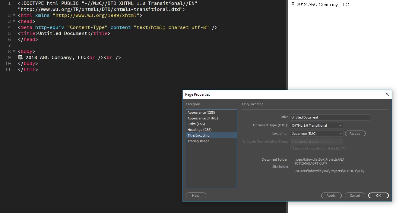 For example, if I have the copyright symbol © in the .html document and I open it in DW, that symbol gets converted to this Chinese character: 息