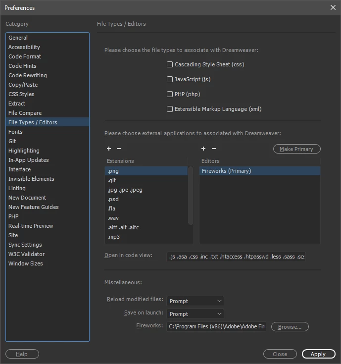 In Dreamweaver in the CC Libraries panel, when I right click > edit on an image Photoshop is launched by default. I want to change the default to Adobe Fireworks.