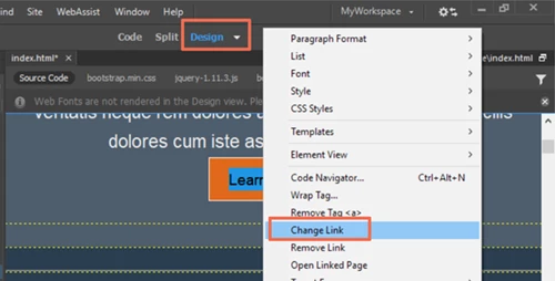 When editing in DreamWeaver, you can click/drag text you want to edit. When you "right-click" options come up, but "change link" is grayed out. Why?