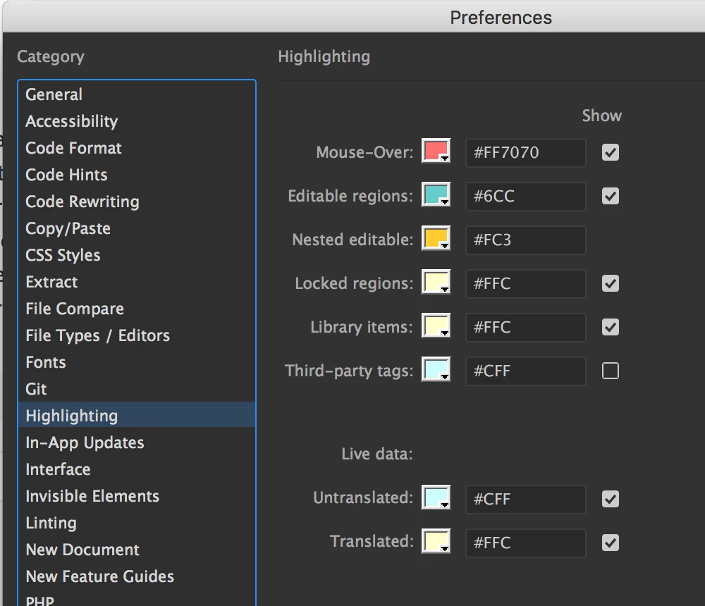 First let me say that I am one of the many who dislike the way DW2018 changes code coloring when things are highlighted. I was able to make changes to the main.less file to stop that from happening, but now that's created another issue when I'm working on files created from a template. There is now no visible difference between editable and non-editable regions of the code. I looked through main.less to see if I could find something that was specific to template files that I may have inadvertently overridden when I made the changes to eliminate the highlighting issue, but I'm having no luck. If someone could point me in the right direction for where to look to change the color of non-editable regions in a file created from a template, I would very much appreciate it!