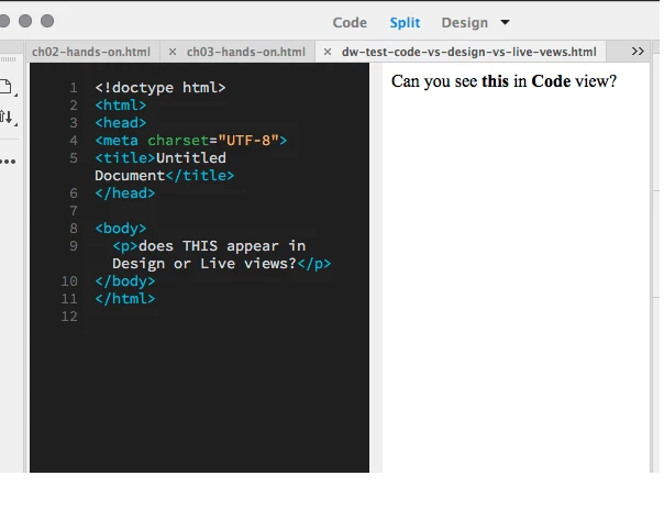 Sometimes the html code does not appear in design or live view and vice versa. Regardless of which view I see or if I click on either side id Split view. Does this happen to anyone else? It does not always happen. (Mac Mini O/S Sierra 10.12.2) See illustration: