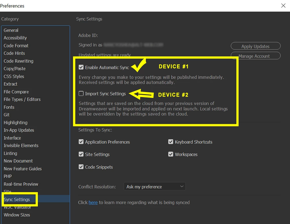 I was updating a page on a clients HTML website, and without telling me, he also started working on the same page (super frustrating and I've had a conversation with him about it so it won't happen again). Anyway, I was having issues connecting to the server and kept getting an FTP error that my user limit was reached and it couldn't connect, so I don't believe I was actually connected. But now it's giving me a conflicting settings error and says that there are sync conflicts and I need to choose which settings to keep, upload sync settings or download sync settings. I can't force close or in any way get out of DW until I select one. I hadn't made any changes on my end so the changes the client made need to stay. Can someone explain this error to me so that I can make an informed decision? What is download sync settings vs upload sync settings? Again, what's on my local computer is not accurate and what is on the website is. See screenshots.