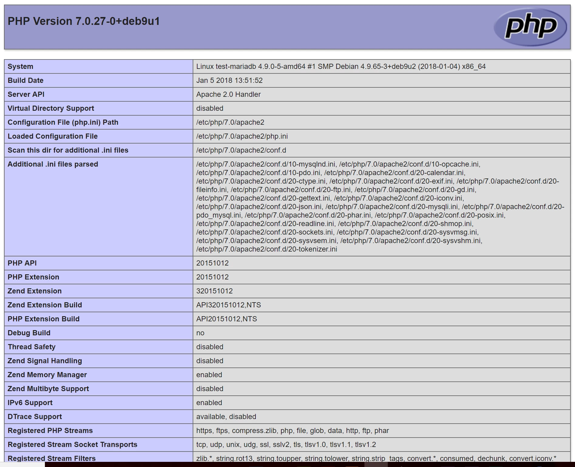 I'm looking at moving our sites to Google Compute Engine on Google Cloud Platform  so I'm running a trial VM. I've spun-up a debian-9-stretch and installed Apache, MariaDB and PHP 7.x.