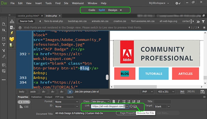 I'm editing someone else's website. When I switched to Dreamweaver. For some reason, there are 4 buttons at the bottom that stopped working. I just want to highlight the text and get it to jump to the right page. How do I do that? I know it's easy. But I'm not a true web designer. I'm an Editor of TV/Film just trying to help this lady out.