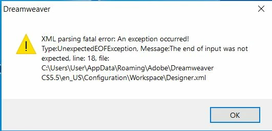 CS5.5 fatal error XML parsing - DW won't open