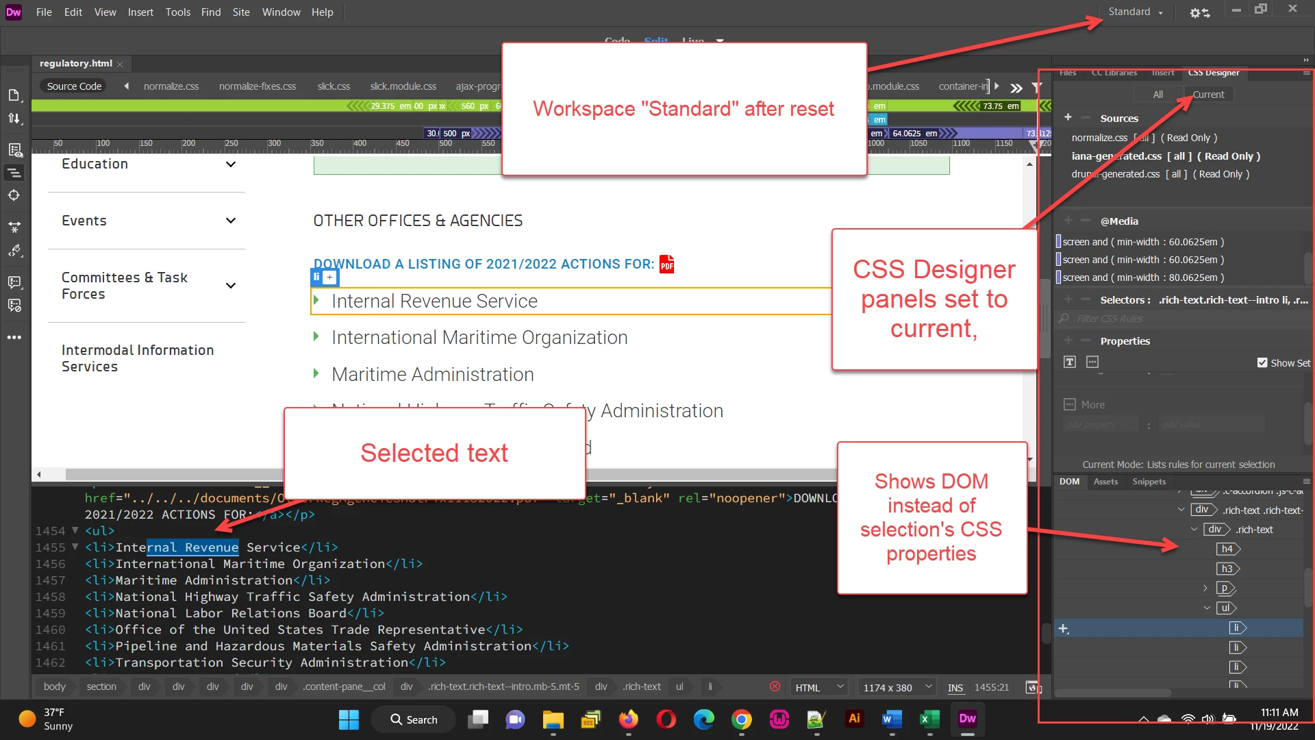 However, even when I "reset" the "standard "workspace, I don't see the css properties, instead the prominent panel shows the DOM tree, as in the image below left. I assume there might be a way to change the settings so I can see a selection's CSS properties, but I've been unable to find any relevant help from Adobe to do so. Anybody know what I need to do?