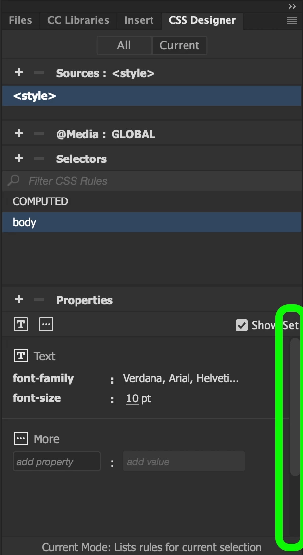 CSS Designer Panel "Current" Not Showing Selected Item's CSS Properties