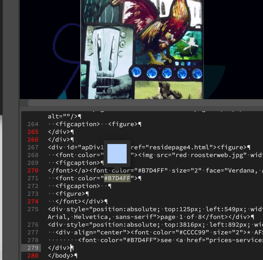 I was a little disappointed that the images do not load and i had to manually move them into place but I made the changes I wanted to the index page, doing a lot of looking at the good code to fix the bad and and it looked great in the Live view when I finished. My index and page one of an overview of my work are the most complex , but I had that 2nd page looking good even thought there was still some red code I want to fix. But when I looked at the site in the live view ( or browser) it is completely distorted and off the edge and overlaps and things moved. Apparently what you see is no guarantee of what you get. How the location info from absolute positioning fails is hard to understand. Kind of semi-absolute