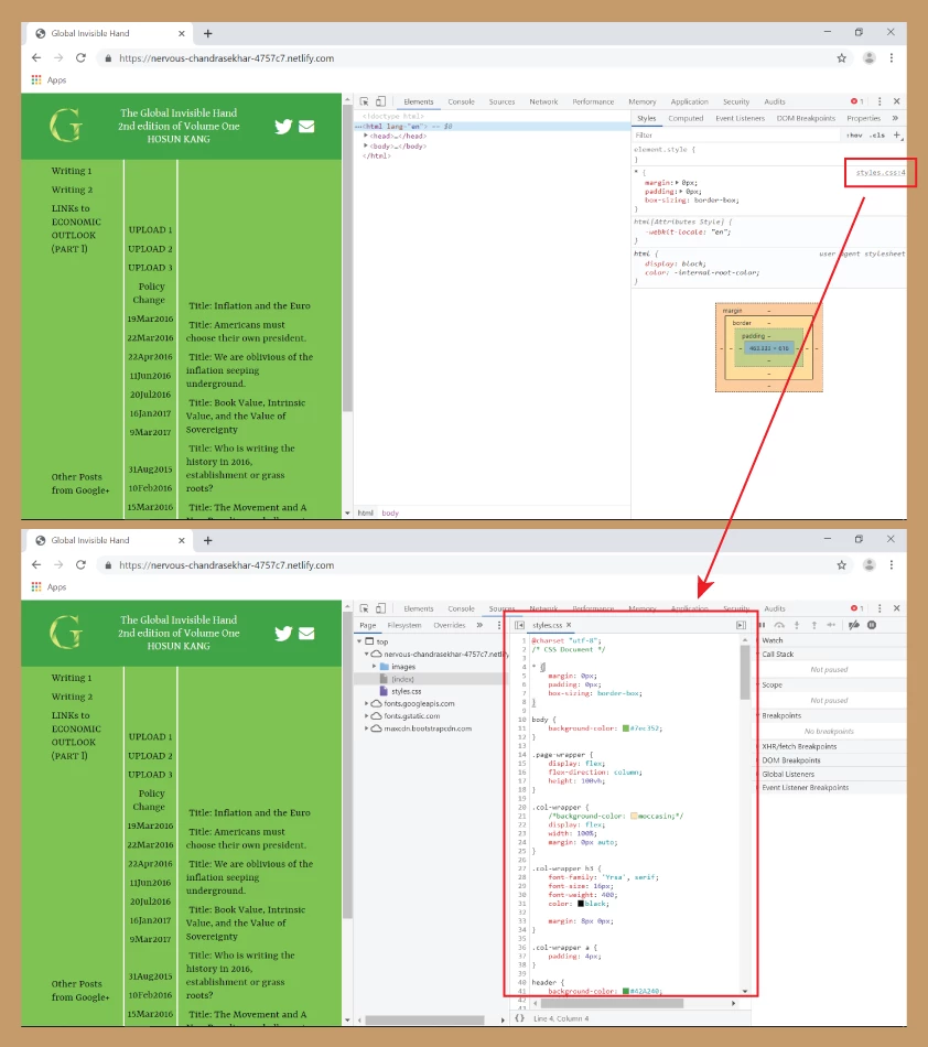 If you click on the little black arrows next to body and head in the left hand panel that will show you the pages code.