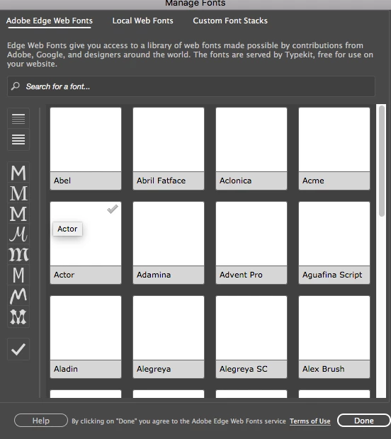 It does not change from this, no matter how long I wait. Can anyone explain how I go about getting a visual look at the fonts that are being named, but not presented visually as is shown in the tutorial video when first starting up Dreamweaver? I have done a bit of research to see if anyone else is having this issue, but wasn't able to find anything really useful. If anyone has any info, I would appreciate the help. Thank you!