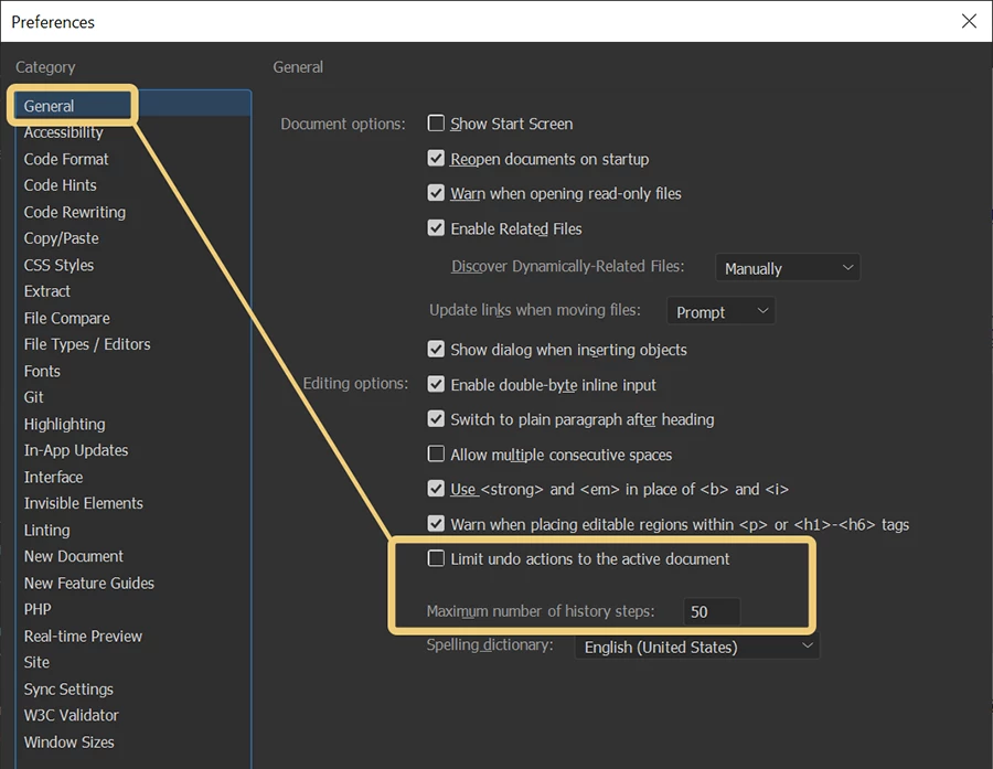 I'm wondering if Dreamweaver has a History Log like Photoshop does. It's accessable in Photoshop through preferences but I'm not seeing an equivalent in Dreamweaver's preferences. Might it be accessable somewhere else or, more likely, it does not exist.