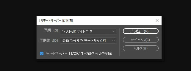 ただ、ローカルではDreamweaverのgit機能も使いたいと思い利用してみたのですが、リモートネットワークと同期する際に、リモートサーバー上にはないローカルファイルを削除にチェックを入れてしまうと隠しファイルのgitの設定まで削除されてしまうようです。