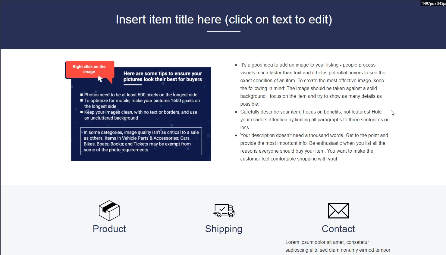 <li><font face="Arial"><span property="description">It's a good idea to add an image to your listing - people process visuals much faster than text and it helps potential buyers to see the exact condition of an item. To create the most effective image, keep the following in mind: The image should be taken against a solid background - focus on the item and try to show as many details as possible.</span></font></li>