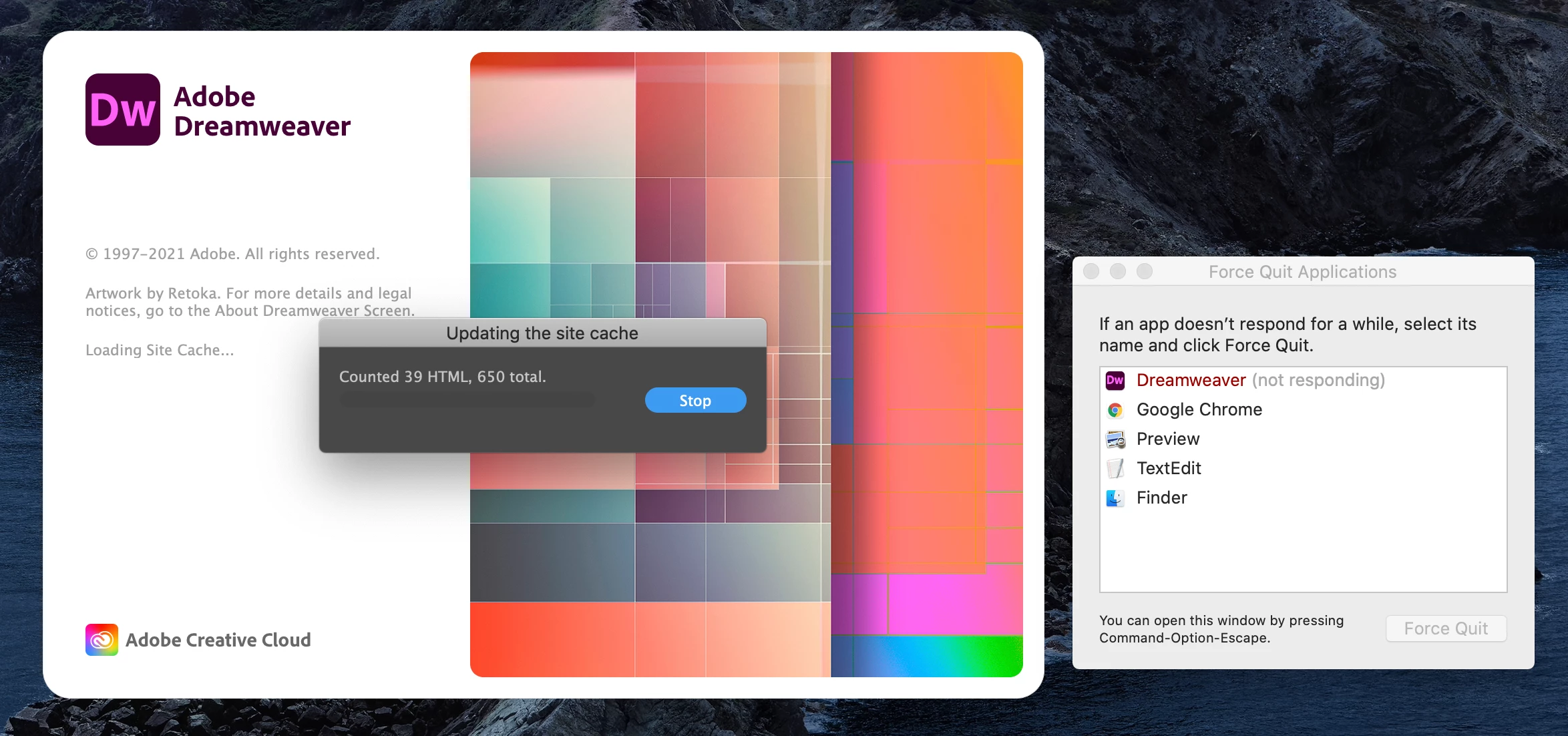 Dreamweaver 2021 won’t launch anymore, it always hangs on launch with ‘updating site cache’ message displaying, but the stop button is unresponsive. It’s always been fine previous to today.