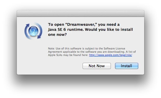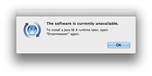 I have a problem with dreamweaver. I really love dreamweaver for building web pages and have used it for years with a PC.  I recently switched from a PC to a MAC but I find that when I open the Dreamweaver app for the first time I get a prompt that says something like "You must download Java SE 6 runtime, would you like to install it now?"   I click yes, and the download fails.  I called Apple about it, they said the software resides on Oracle's Java web site, and its out of their control.  I go to the Oracle Java web site it says "Apple supplies their version of Java SE 6 runtime and there's no way to download it from the Java.com site.  All this means is that YOUR software does not work on my MAC because these two companies can't agree on who suppies this software.