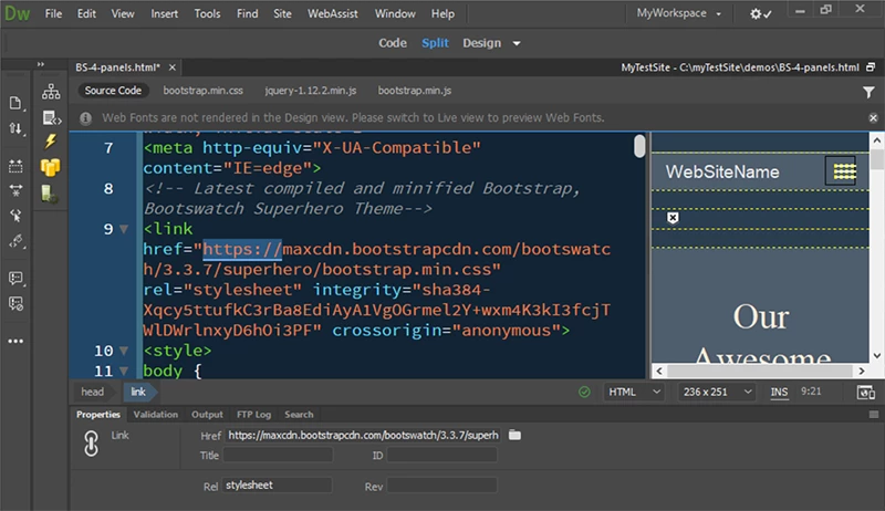 5. Can you share the workspace snapshot of Dw so that we can see the panels/toolbars that you have enabled?