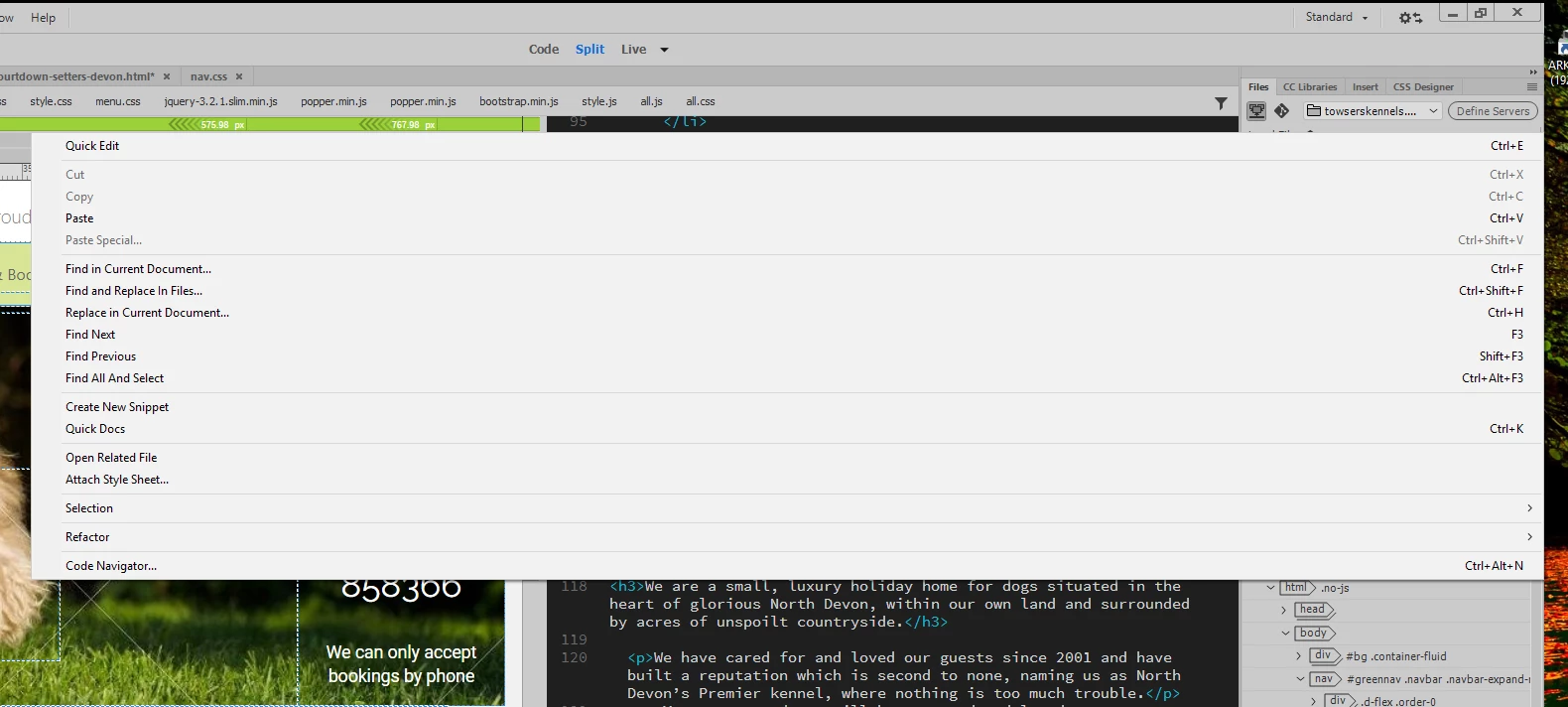 Working in split view the R click context menu stretches across the page if I click on an item of code. But if I R click on the design or live view split side the context is normal size. How can I change this please so that it is normal width in both? See example of extended width below.