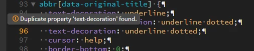 Also two other errors 'duplicate property 'text-decoration' found' and 'duplicate property 'position' found.