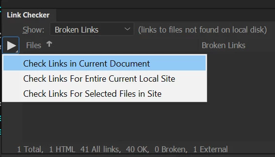 Dreamweaver check links on current document