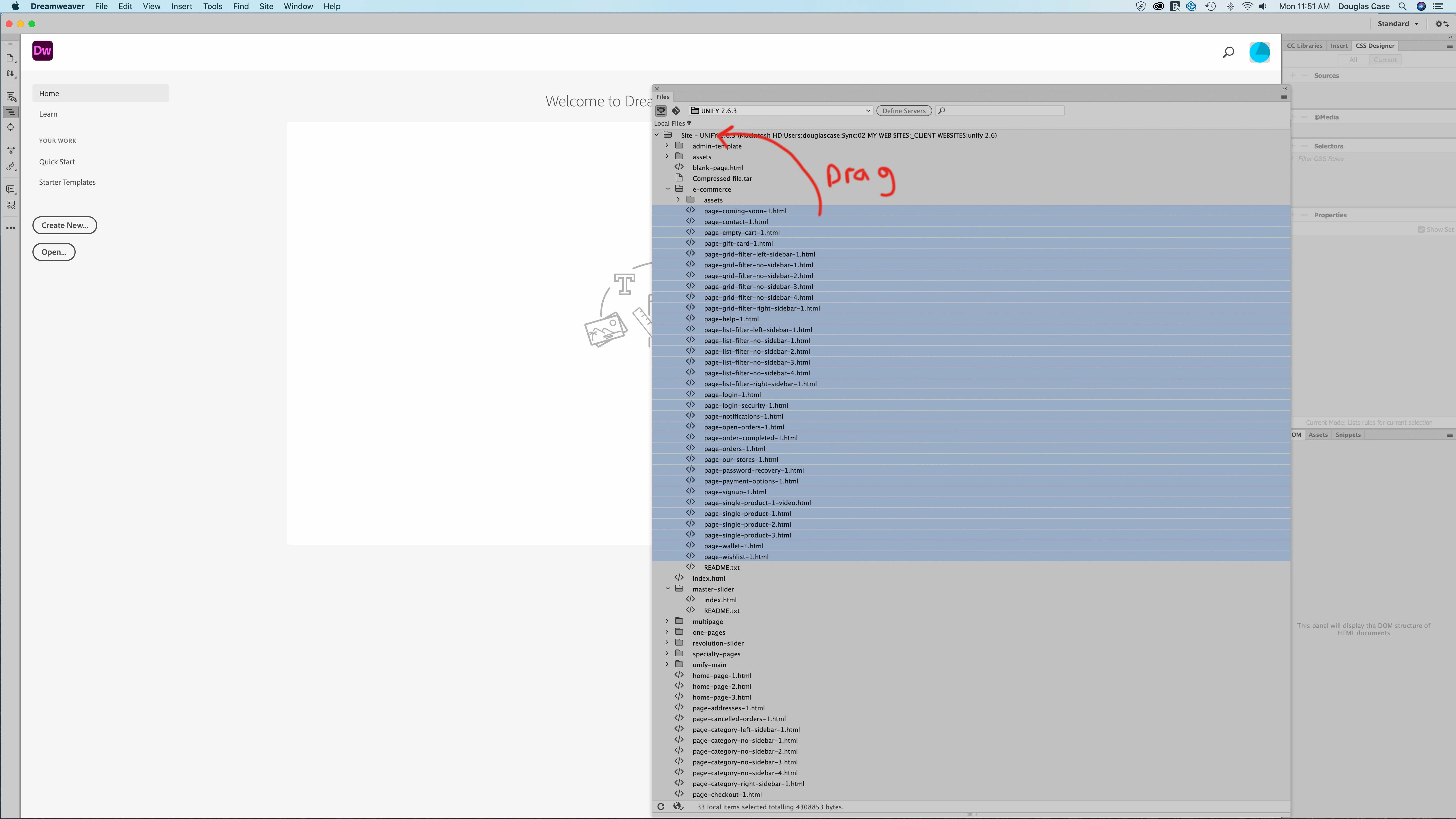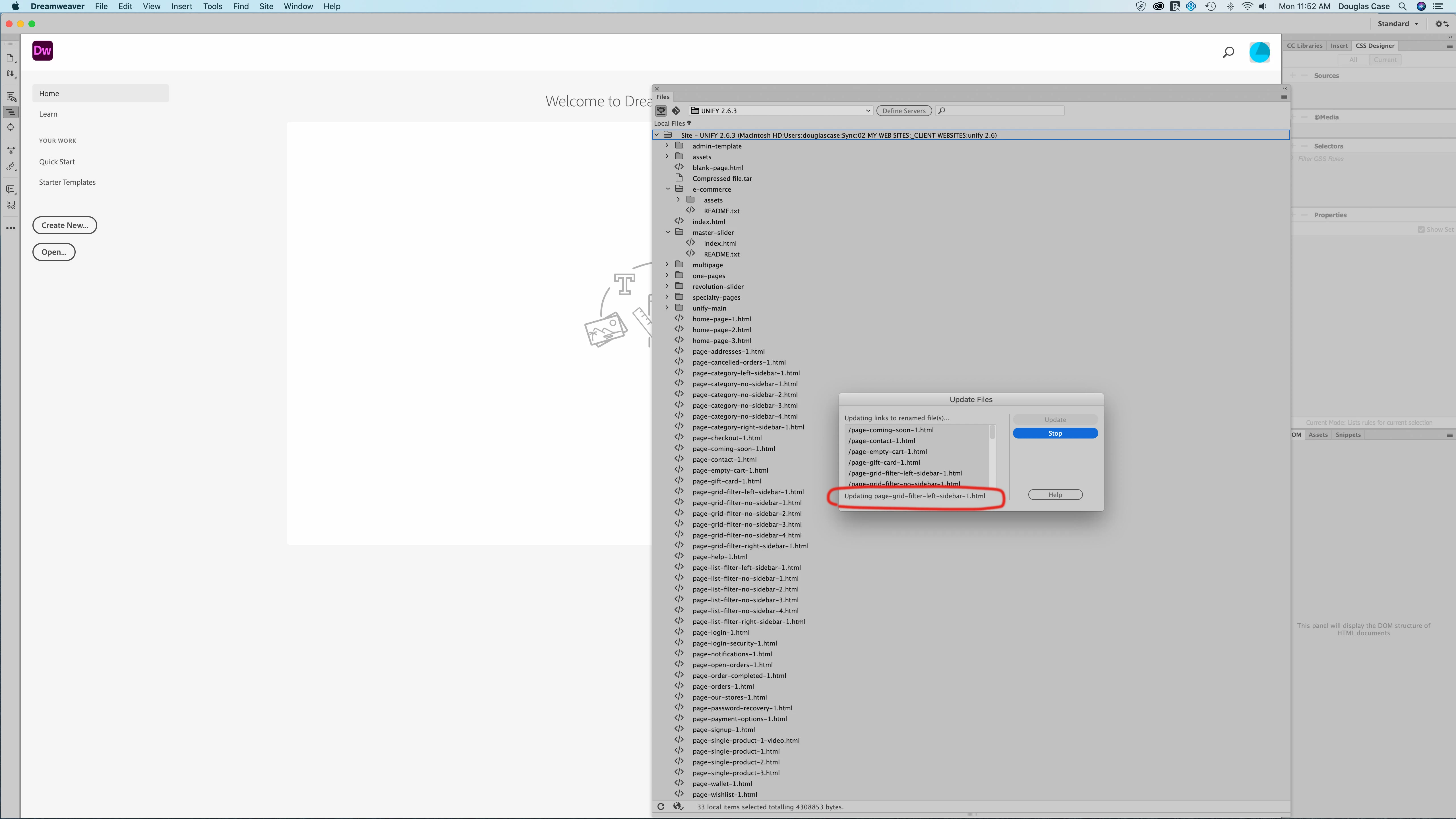 Dreamweaver also randomly crashes sometimes when changing from one site to another in the files menu. This seems to be random and not associated to any particular site.