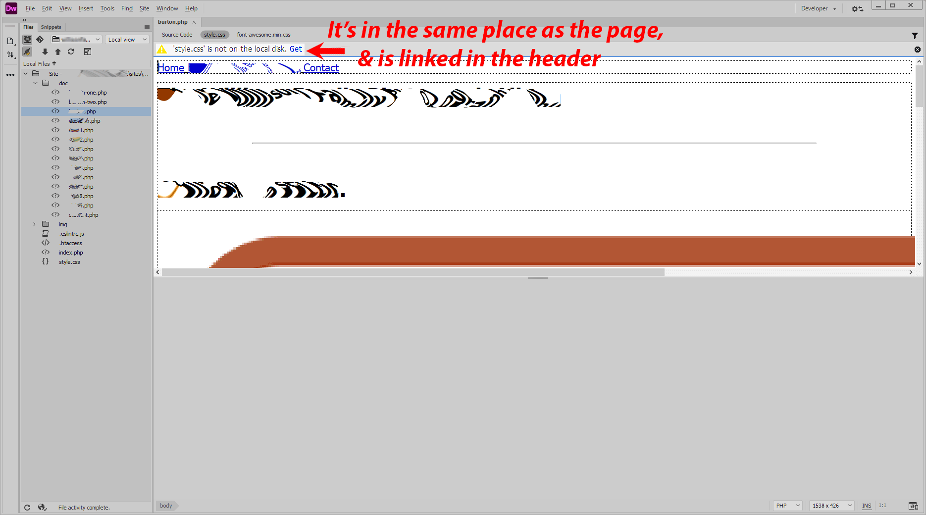 I don't know in which sense you mean the word, in the same place, as far as I can see, your PHP document is in a doc folder, and your CSS style in the root of the site... so the path should look like ../style.css ... is that right?