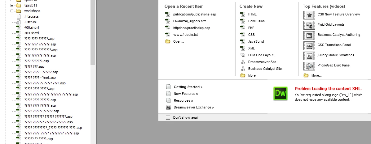 My webpage has some url's with Hebrew characters. When logging to dreamweaver (CS6, on Windows 10, website is on a Windows platform), I get an error message that relates to the language (see the red error message on the right).