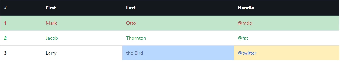 <!doctype html> <html><head> <meta charset="UTF-8"> <title>Untitled Document</title> <meta name="viewport" content="width=device-width, initial-scale=1, shrink-to-fit=no"> <link rel="stylesheet" type="text/css" href="https://stackpath.bootstrapcdn.com/bootstrap/4.1.3/css/bootstrap.min.css" integrity="sha384-MCw98/SFnGE8fJT3GXwEOngsV7Zt27NXFoaoApmYm81iuXoPkFOJwJ8ERdknLPMO" crossorigin="anonymous"> <script type="text/javascript" src="https://code.jquery.com/jquery-3.3.1.slim.min.js" integrity="sha384-q8i/X+965DzO0rT7abK41JStQIAqVgRVzpbzo5smXKp4YfRvH+8abtTE1Pi6jizo" crossorigin="anonymous"></script> </head> <body> <div class="container"> <div class="row"> <div class="col"> <div class="table-responsive"> <table class="table"> <thead class="thead-dark"> <tr> <th scope="col">#</th> <th scope="col">First</th> <th scope="col">Last</th> <th scope="col">Handle</th> </tr> </thead> <tbody> <tr class="table-success text-danger"> <th scope="row">1</th> <td>Mark</td> <td>Otto</td> <td>@mdo</td> </tr> <tr class="table-muted text-success"> <th scope="row">2</th> <td>Jacob</td> <td>Thornton</td> <td>@fat</td> </tr> <tr> <th scope="row">3</th> <td>Larry</td> <td class="table-primary text-black-50">the Bird</td> <td class="table-warning text-primary">@twitter</td> </tr> </tbody> </table> </div> </div> </div> </div> <script type="text/javascript" src="https://cdnjs.cloudflare.com/ajax/libs/popper.js/1.14.3/umd/popper.min.js" integrity="sha384-ZMP7rVo3mIykV+2+9J3UJ46jBk0WLaUAdn689aCwoqbBJiSnjAK/l8WvCWPIPm49" crossorigin="anonymous"></script> <script type="text/javascript" src="https://stackpath.bootstrapcdn.com/bootstrap/4.1.3/js/bootstrap.min.js" integrity="sha384-ChfqqxuZUCnJSK3+MXmPNIyE6ZbWh2IMqE241rYiqJxyMiZ6OW/JmZQ5stwEULTy" crossorigin="anonymous"></script> </body></html> |