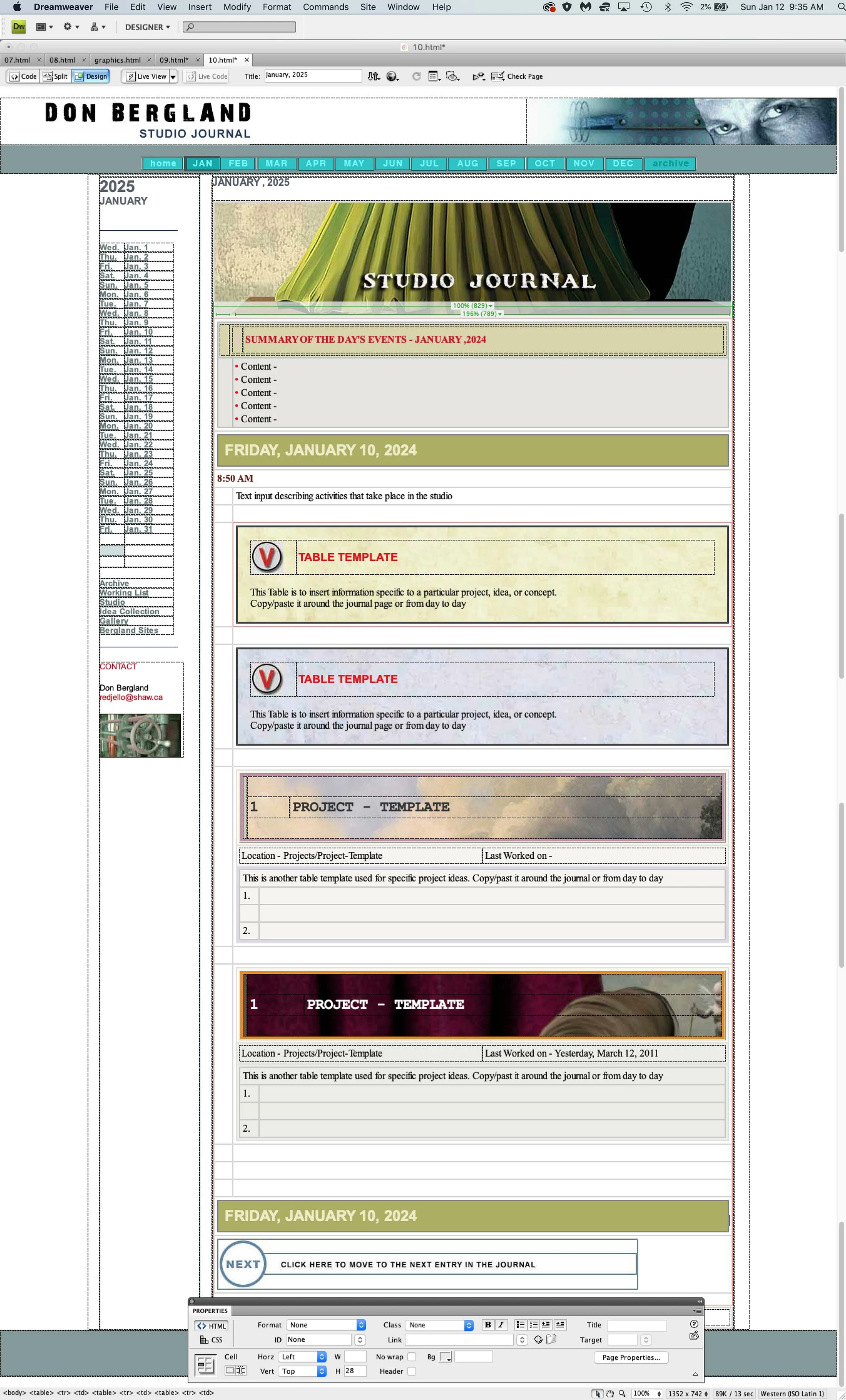 I offer a screenshot of a blank journal page constructed in Dreamweaver 3, with several of the tables I'm referring to.