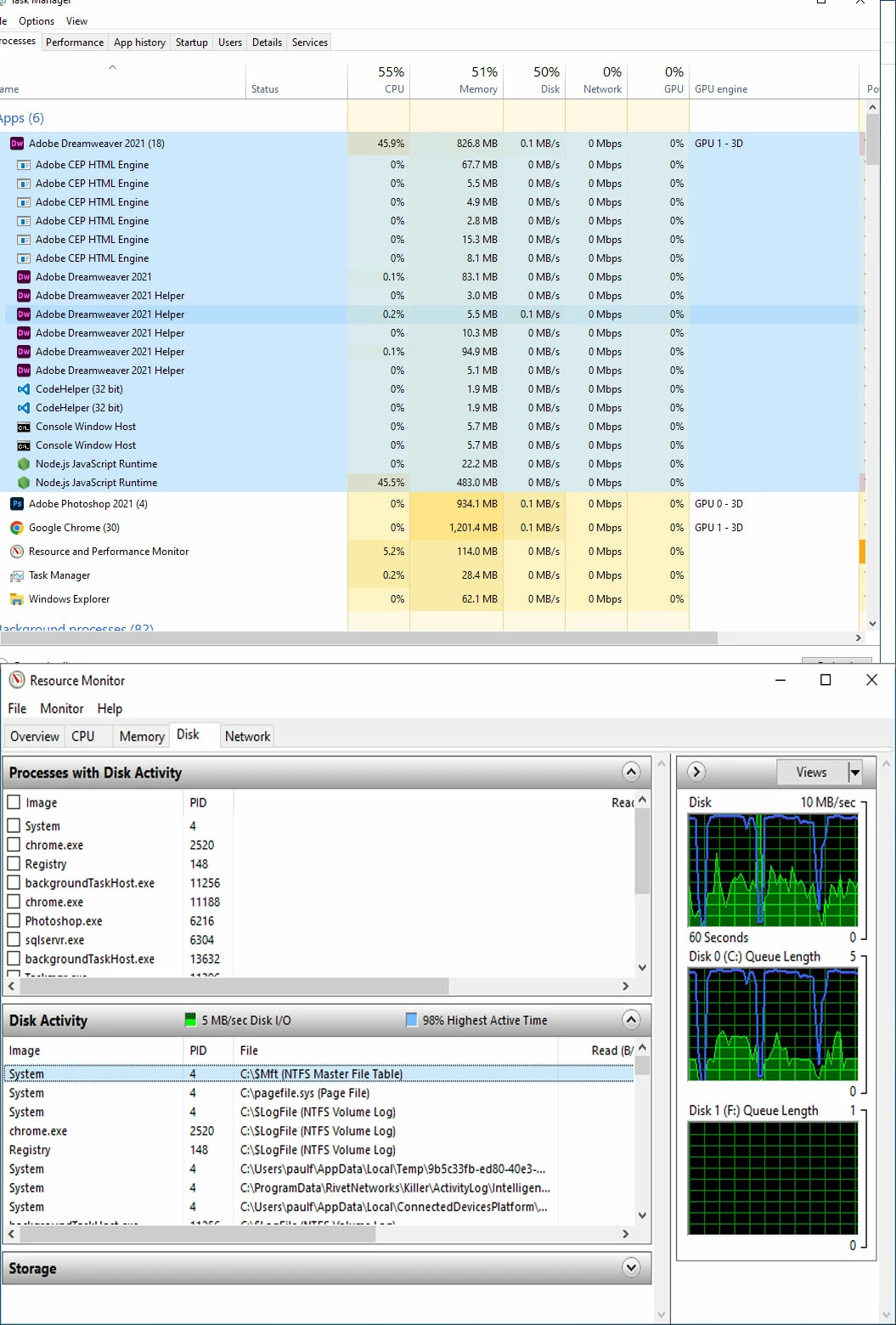 for the past 2 months everytime I launch dreaweaver is goes to 100% disk. I assume that adobe pushed new programs.