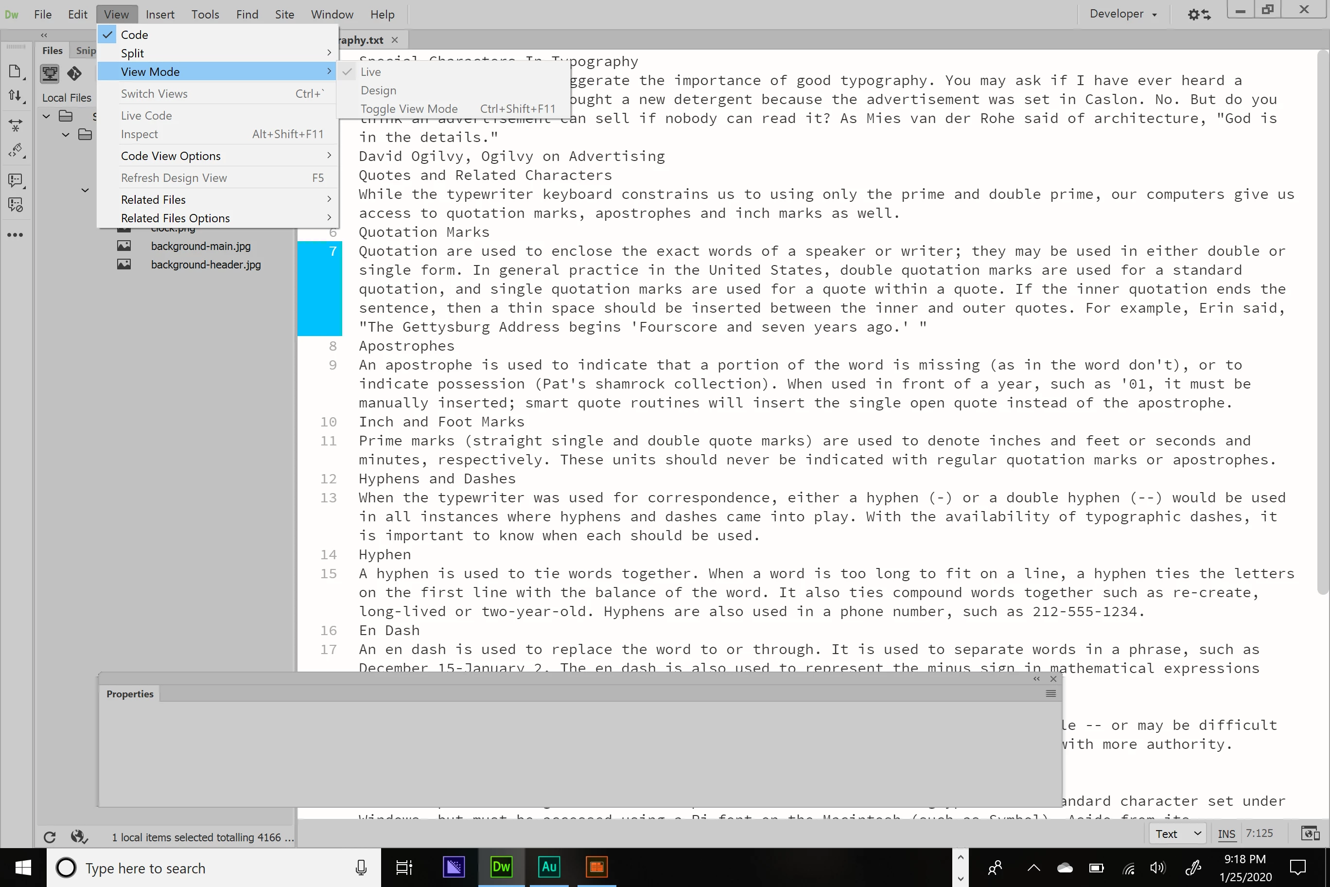 I'm supposed to be able to view this site in design mode (for a school assignment) but Dreamweaver is not even giving me the option to switch to anything but live mode? It's for an assignment in a book called Adobe Dreamweaver CC 2018: The Professional Portfolio Series but my version of Dreamweaver is 2019 I think- is that my problem?