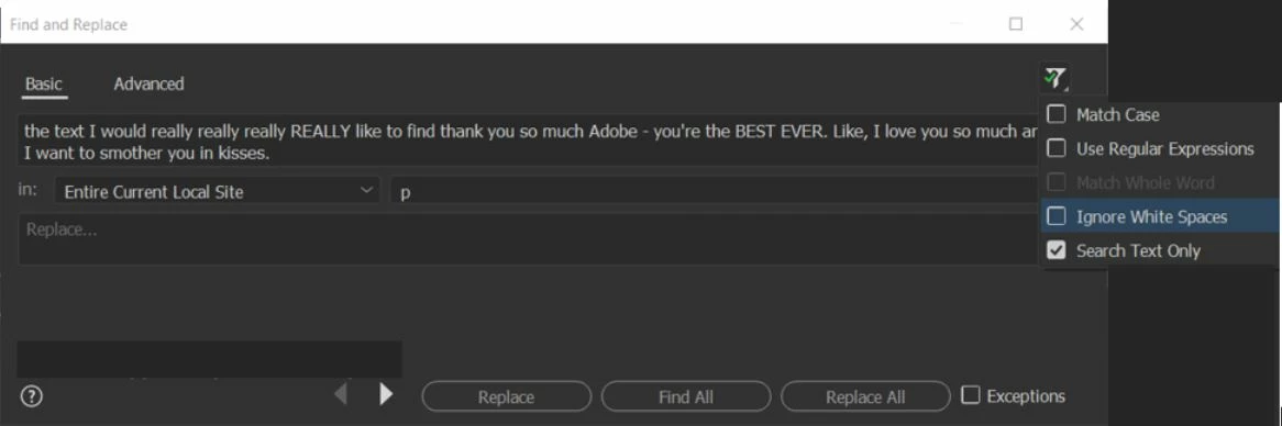 Your search feature no longer makes it possible specify "find in: Current Document | Open Documents | Folder | Whole site" - only in current document. I also don't seem to be able to specify case sensitivity for the search.