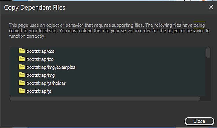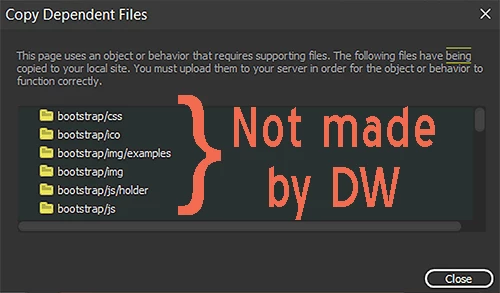ADDENDUM: also notice related issue where when I open pages that have been created outside of DW for the first time, i get this popup (you have a spelling error too, btw... see attachment), which creates BOOTSTRAP and SCRIPTLIBRARY folders within my local site and proceeds to insert the above lines of code into my file.