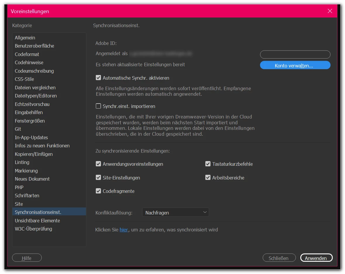 resetting Dreamweaver (»Hold down the Windows key + Ctrl + Shift and double-click Dreamweaver.exe.«) means, that all my personal preferences, e.g. shortcuts, will be deleted and therefore I have to restore them by hand – or by the synchronization settings?