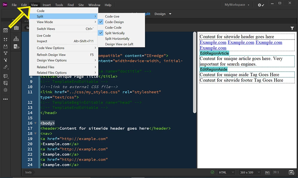 Go to View > SPLIT > Code-Design, Split-Vertically (see screenshot).