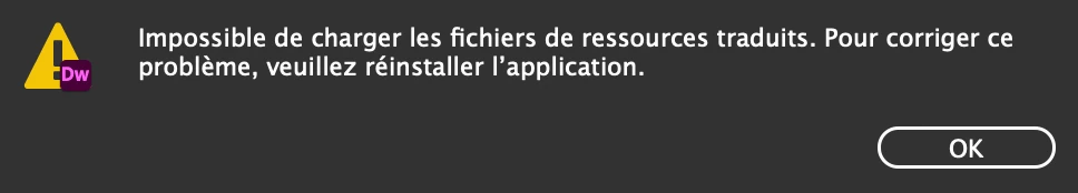 Je n'arrive pas à lancer Dreamweaver j'ai le message :"Impossible de charger les fichiers de ressources traduits . Pour corriger ce problème, veuillez réinstaller l'application"