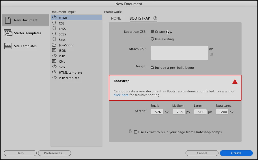 At this point a Bootstrap message popup appears "Cannot create a new document as Bootstrap customization failed. Try again or click here for troubleshooting."