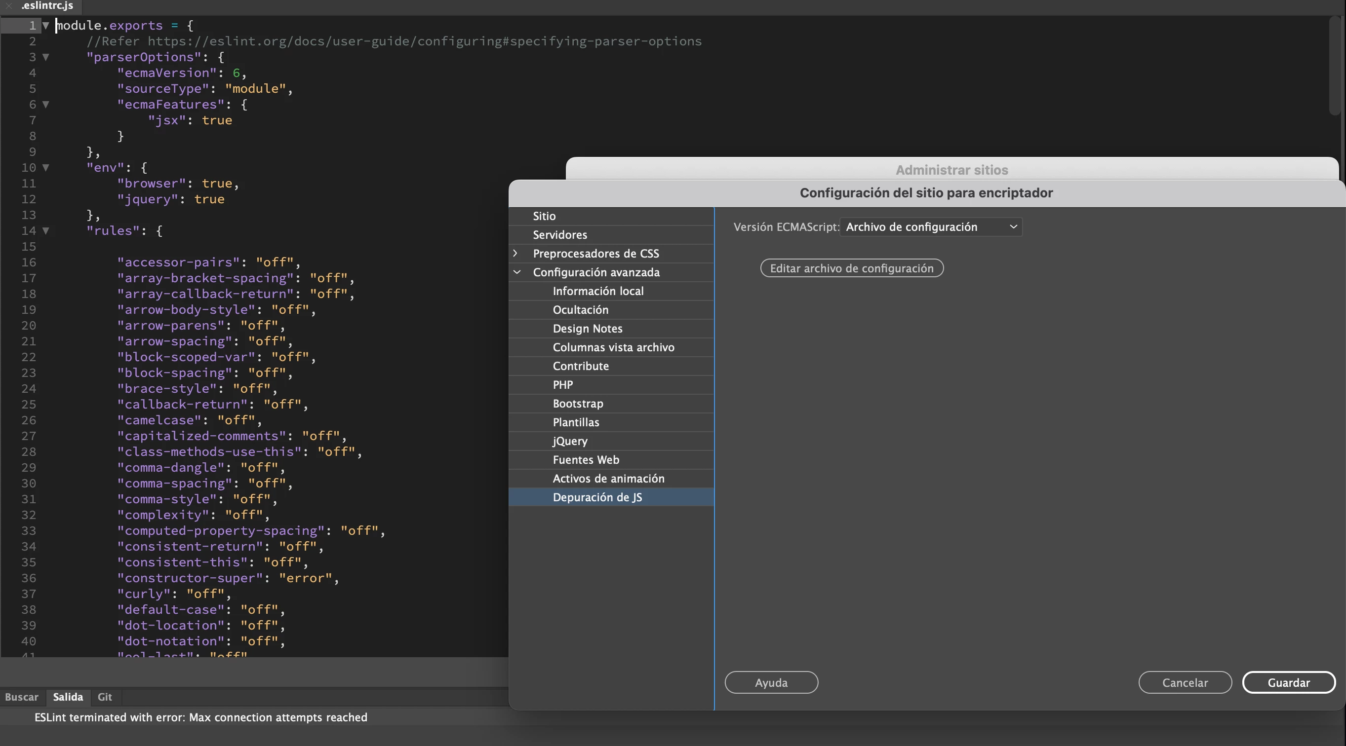 siempre aparece ESLint terminated with error: Max connection attempts reached