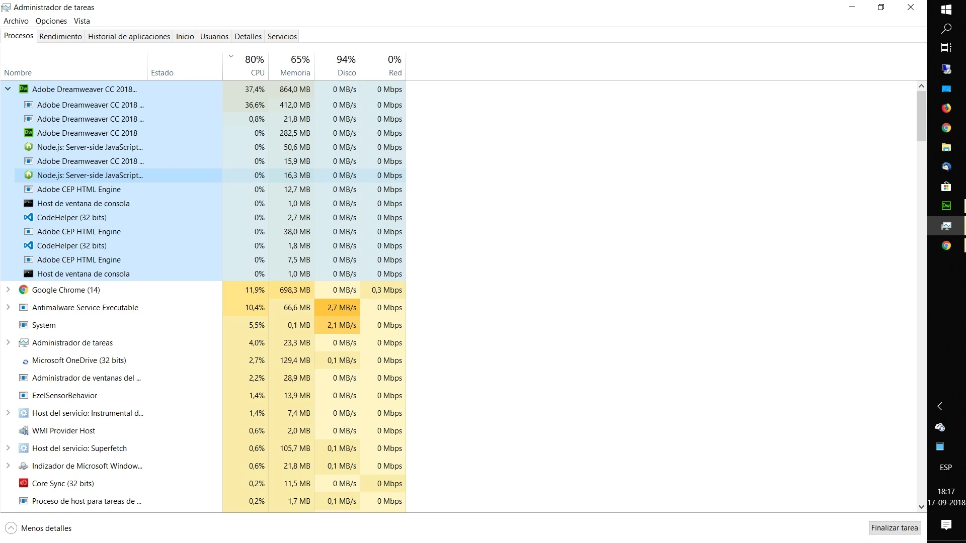 Excesivo uso de CPU en producto DreamWeaver CC 2018