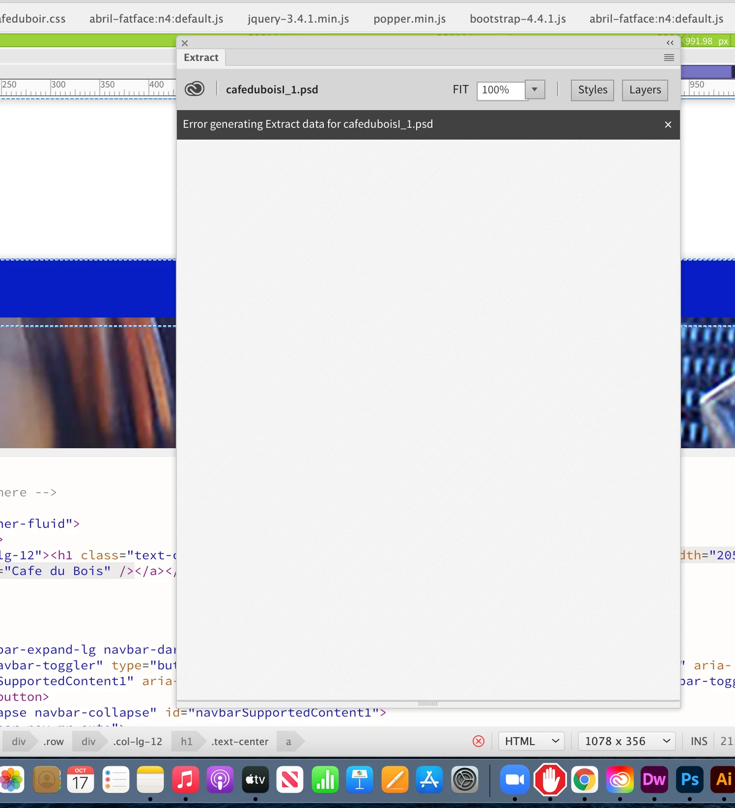BBfloodParticipantForum|Forum|4 years agoOctober 17, 2021QuestionExtract in DreamweaverForum|Forum|4 years agoOctober 17, 20211 reply117 viewsI'm having issue extracting my PSD to web design. This keeps showing up, tried signing out and uninstalling the dreamweaver but nothing seem to change