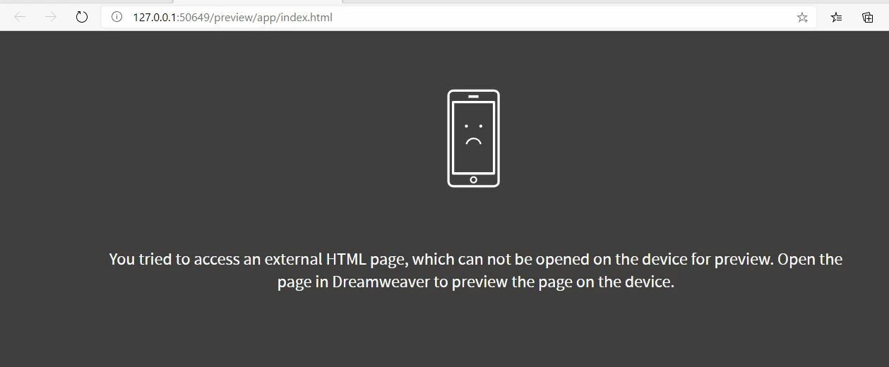 "You tried to access an external HTML page, which can not be opened on the device for preview. Open the page in Dreamweaver to preview the page on the device."