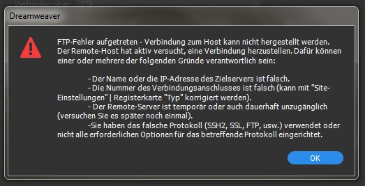 Wir nutzen aktuell die Version CC 2015, sowie die Version CC 2018 - jedoch auf zwei unterschiedlichen Arbeitsplätzen. Beide PCs sind mit dem gleichen Netzwerk verbunden und haben exakt die gleichen Einstellungen im Bereich "Sites verwalten". Dennoch erhalten wir bei der Version CC 2018 immer wieder diese Fehlermeldung
