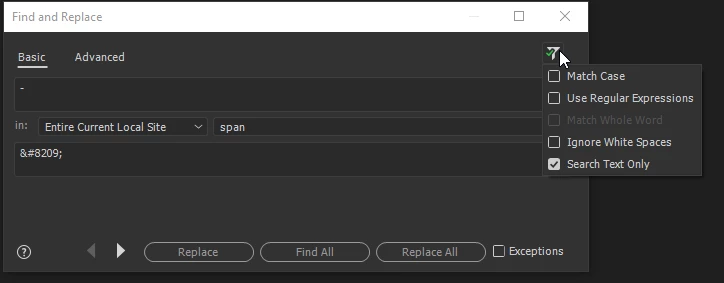 I am attempting to change all hyphens found in a span we use for item #s to the code for a non-breaking hyphen. Finding them is no problem, this search pulls them up. However replacing them is what's stumping me. I don't seem to have the ability to only replace the hyphen - my only relevant option seems to be to replace all the contents of the tag. What I want to do is leave everything except the hyphen as is. The rest of the text is different in each case, so I can't replace all contents.