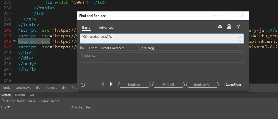 I'm looking for a way to go through a folder with HTML files and list the files that are missing a certain string. Is there a way to do this with Dreamweaver 21.2 in Windows 10?