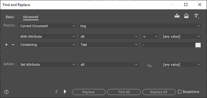 How might I tell Dreamweaver (version 20) to go thru the current page & find all of the "-" hyphen characters that are located inside ALT attributes inside IMG tags. Very similarly then I need to do the same with the TITLE attributes.