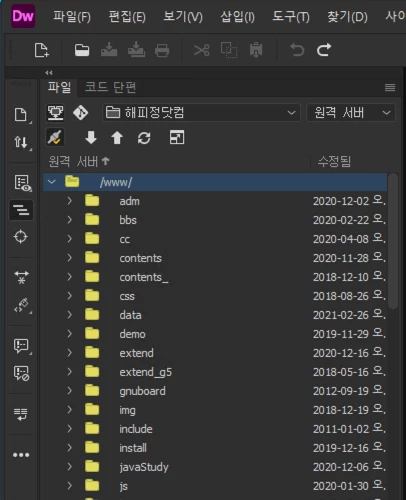 드림위버 탐색기에서 폴더와 파일이 이름으로 정렬이 되고 있습니다.
