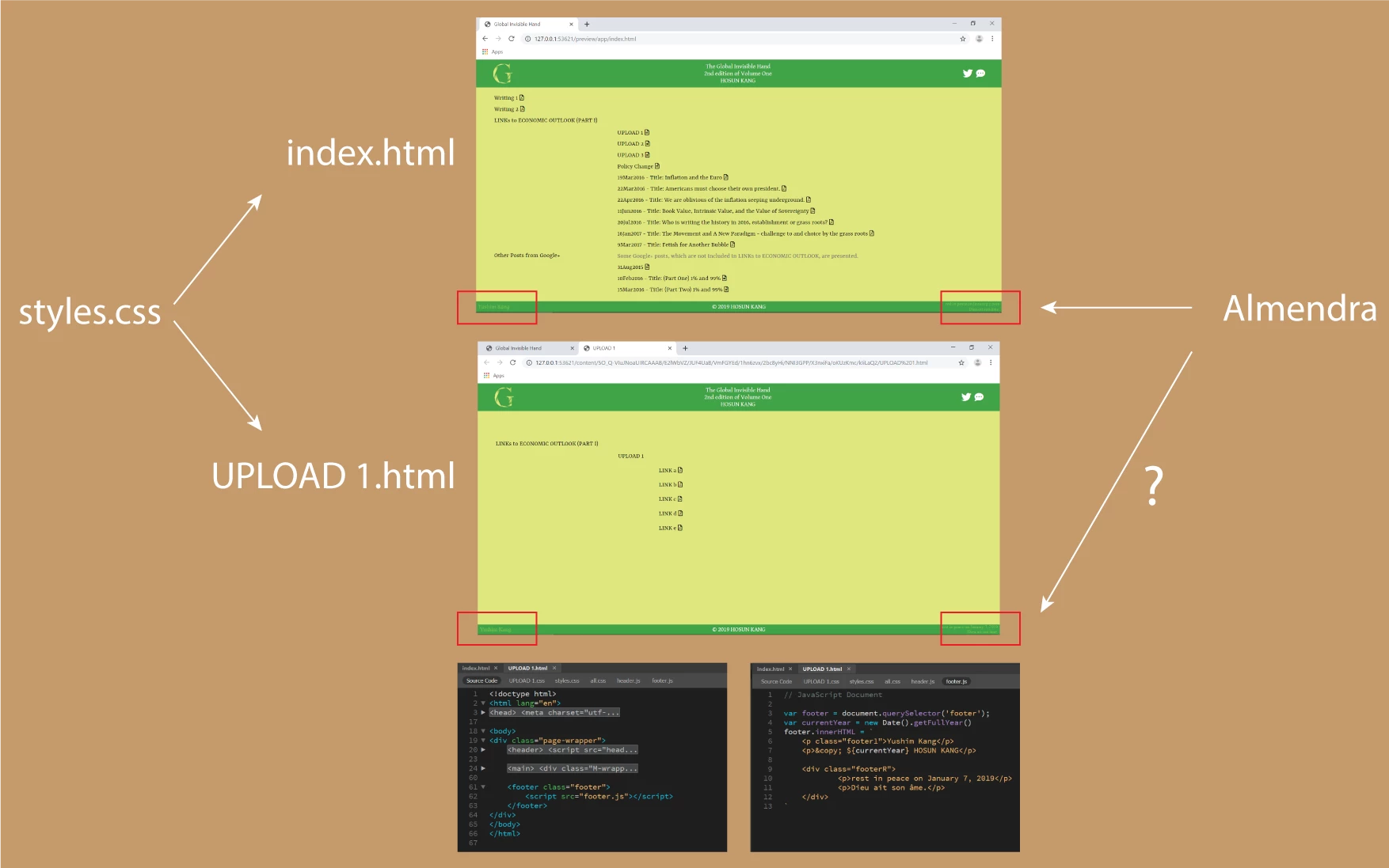 Opening UPLOAD 1.html from index.html, there is footer, which comes from footer.js.