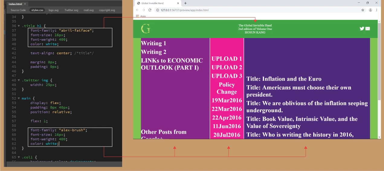 To ".title h1" and "main", I applied the same styles for font, except for font-family.